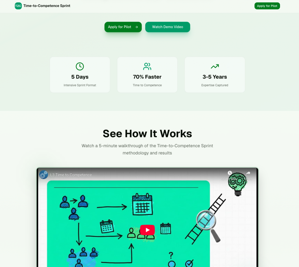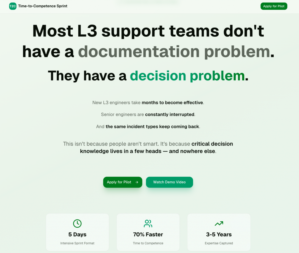 The Time-to-Competence Sprint framework focuses on rapidly accelerating the capability of Level-3 technical support engineers by capturing and transferring decision-making expertise that otherwise resides tacitly in senior engineers’ heads. The site argues that the real bottleneck is not traditional training content, but decision knowledge — knowing which symptoms matter, which diagnostics are effective, and when to escalate — and that this knowledge is rarely codified in usable form. The sprint extracts patterns from real incidents, interviews with senior staff, and recurring decision pathways to generate structured competence maps, playbooks, case libraries, and escalation rules that shorten ramp-up time and reduce dependency on a few individuals.